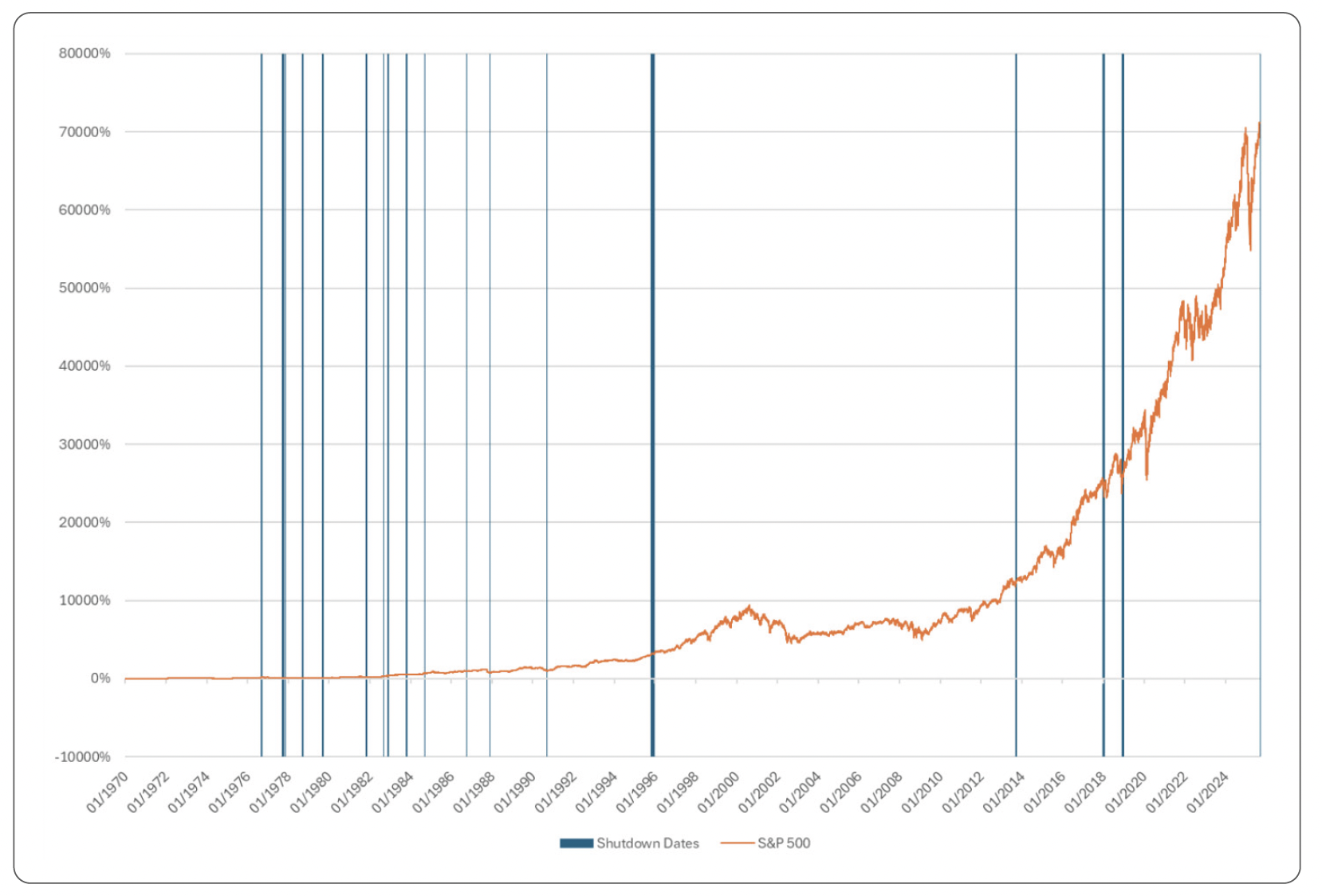 Most crucially, previous US government shutdowns have had little to no impact on the financial markets. This might feel odd, given the intimate relationship between the operating status of a government and its domestic economy, but it’s important to remember that in the entire history of government shutdowns only three have exceeded 15 days in length, and only one has lasted longer than a month. Over these timespans, there simply hasn’t been time for the impact of the shutdowns to trickle through to the performance of securities. This can be demonstrated by the graph below, which demonstrates the fleetingness of shutdowns when compared against the decades long march of market growth: