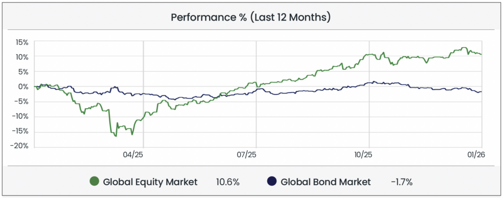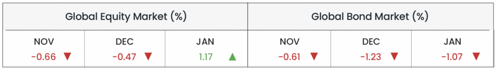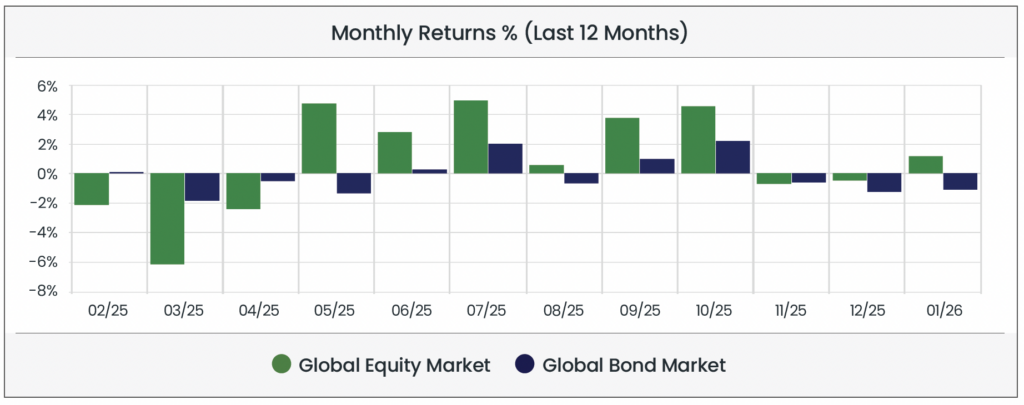 Global equity markets began the year with cautious optimism, rebounding from negative returns in November and December. Investor sentiment remained measured, as elevated technology valuations and ongoing geopolitical tensions continued to weigh on equities. Fixed income markets faced pressure amid shifting expectations for monetary policy and economic growth. Japanese government bond yields rose to multi-year highs ahead of a stimulus package from the newly elected Prime Minister, pressuring bond prices. In the US, the Federal Reserve held interest rates at 3.50-3.75% in January, signalling a pause in tightening while monitoring economic conditions.