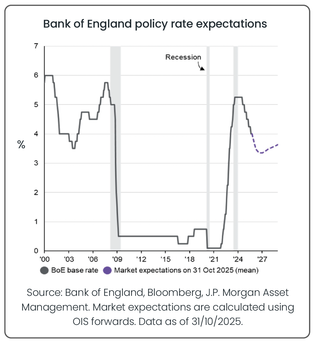 The final week of October brought another small shift in the global interest rate story. The US Federal Reserve (the Fed) cut rates by 0.25%, bringing its benchmark rate down for the second time in three months. The decision reflected a softer run of economic data, including slower hiring and easing inflation pressures. Fed Chair Jerome Powell noted that while growth has moderated, inflation is finally moving closer to the Fed’s 2% target, giving the central bank scope to lend a little more support to the economy. However, Powell warned that further cuts are “not a foregone conclusion.” The ongoing political wrangling in Washington and the potential for another government shutdown (the current one not yet being resolved) later this year have made policymakers cautious. Markets still expect one more cut by early 2026, but the Fed has made clear it wants to see stronger evidence that inflation will stay contained before committing to a longer easing cycle.