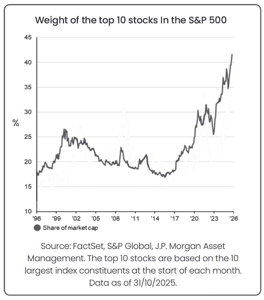 Our accompanying chart illustrates this trend clearly: the weight of the top 10 stocks in the S&P 500 has climbed from around 17% in 1996 to over 40% today. This unprecedented concentration means a handful of large-cap technology names now drive a disproportionate share of market returns. If sentiment towards these firms shifts, the impact could ripple quickly through broader equity markets. For investors, the takeaway is clear: maintain diversification. By holding assets across different regions, sectors, and styles, portfolios are better positioned to weather any potential pull-back in overheated parts of the market while still participating in long-term growth opportunities.