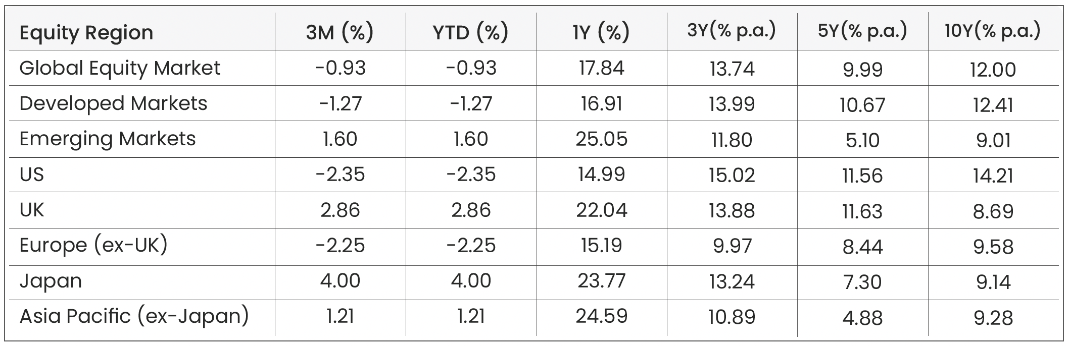 Equity Indices: Morningstar Global Markets (Global Equity Benchmark) | Morningstar Developed Markets | Morningstar Emerging Markets | Morningstar US Market | Morningstar UK Market | Morningstar Developed Market Europe (ex-UK) | Morningstar Japan | Morningstar Asia Pacific (ex-Japan)