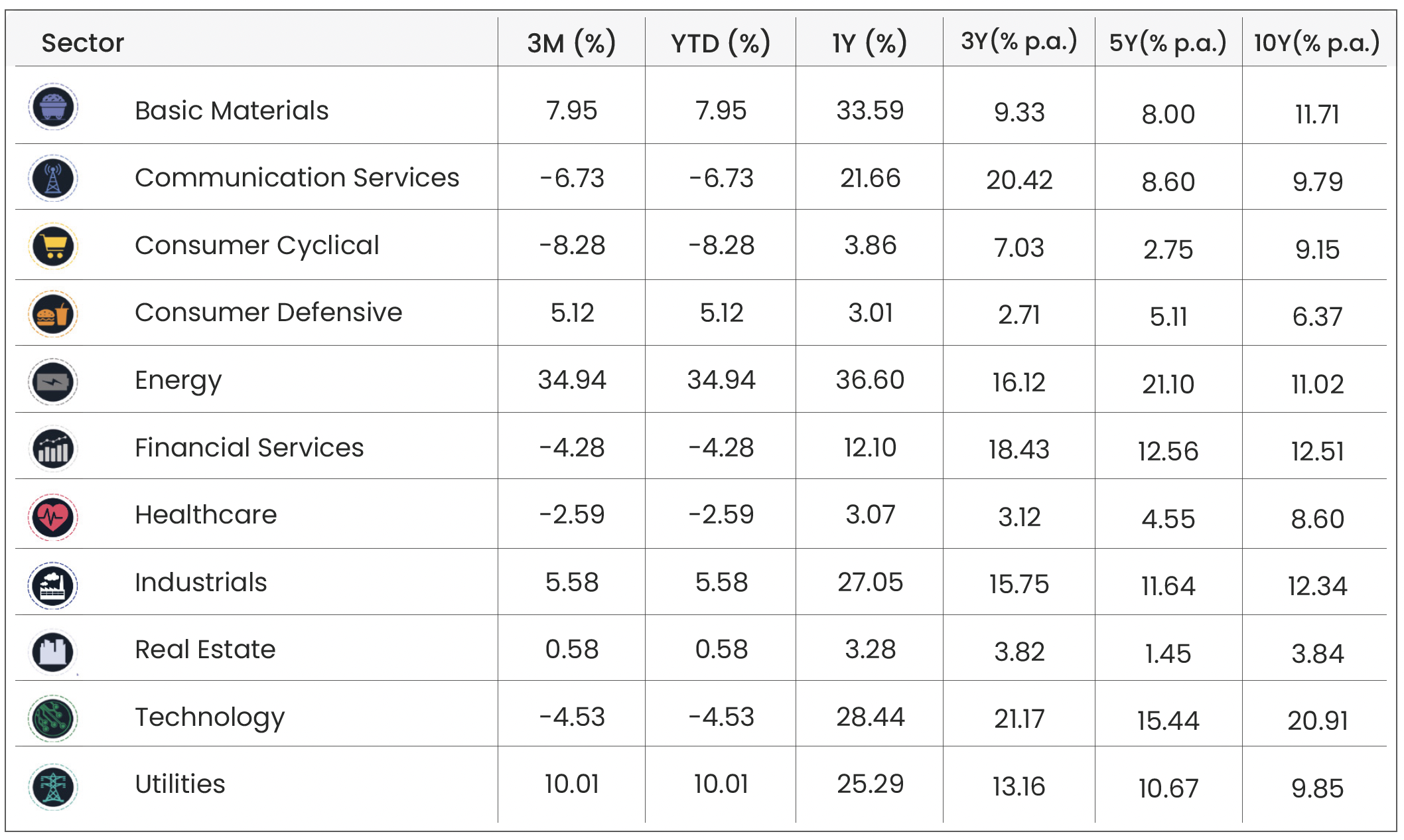 Sector Indices: Morningstar Global Basic Materials | Morningstar Global Communication Services | Morningstar Global Consumer Cyclical | Morningstar Global Consumer Defensive | Morningstar Global Energy | Morningstar Global Financial Services | Morningstar Global Healthcare | Morningstar Global Industrials | Morningstar Global Real Estate | Morningstar Global Technology | Morningstar Global Utilities