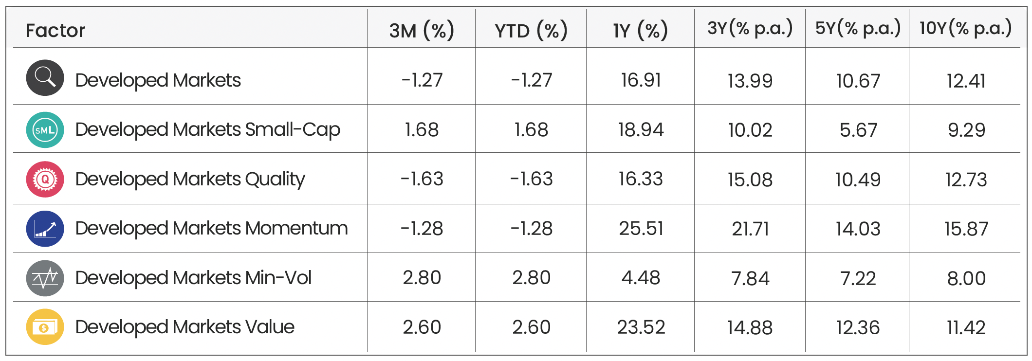 Factor Indices: Morningstar Developed Markets (Factor Benchmark) | Morningstar Developed Markets Small-Cap | Morningstar Developed Markets Quality | Morningstar Developed Markets Momentum | Morningstar Developed Markets Min-Vol | Morningstar Developed Markets Value