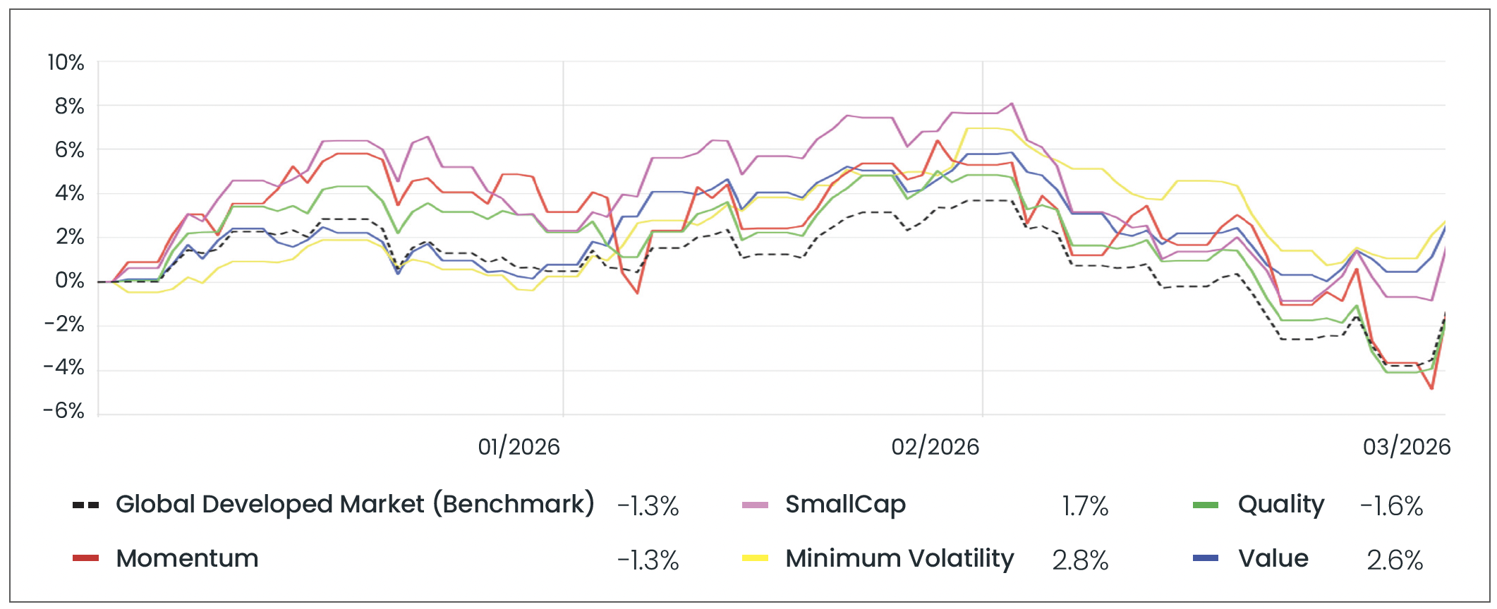 There was a clear rotation towards the defensive Minimum Volatility and Value factors in Q1, which both outperformed the broader developed markets with returns of 2.8% and 2.6%, respectively. This shift reflects investor repositioning as geopolitical risks intensified and growth concerns began to build. In this environment, investors typically favour more resilient, income-generating exposures over other segments of the market, reinforcing the broader risk-off tone that emerged toward the end of the quarter.