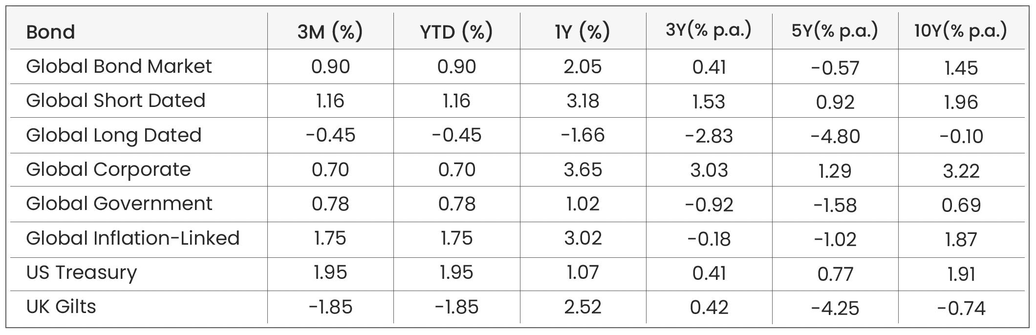 Bond Indices: Bloomberg Global Aggregate (Global Bond Benchmark) | Bloomberg Global Aggregate 3-5 Yr | Bloomberg Global Aggregate 10+ Yr | Bloomberg Global Aggregate Corporate | Bloomberg Global Aggregate Government | Bloomberg Global Inflation-Linked | Bloomberg US Treasury | FTSE Actuaries UK Conventional Gilts All Stocks