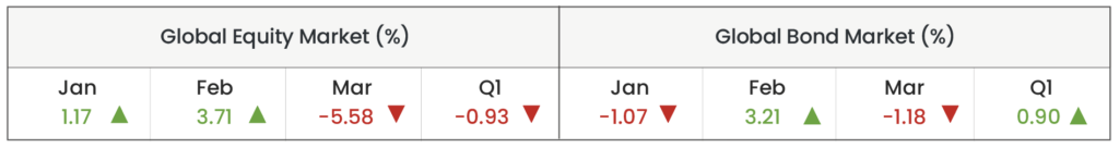 Global bond markets posted marginal gains despite negative results in January and March. Markets entered the year expecting continued easing from central banks, but the Fed’s decision to hold rates steady signalled a more cautious approach. This led to a modest repricing of rate expectations, with bond returns slightly negative. February’s gains were largely caused by deteriorating risk sentiment and deepening demand for safe-haven assets. Inflation fears caused by the conflict in the Middle East contributed to a dip in the global bond markets in March.