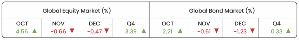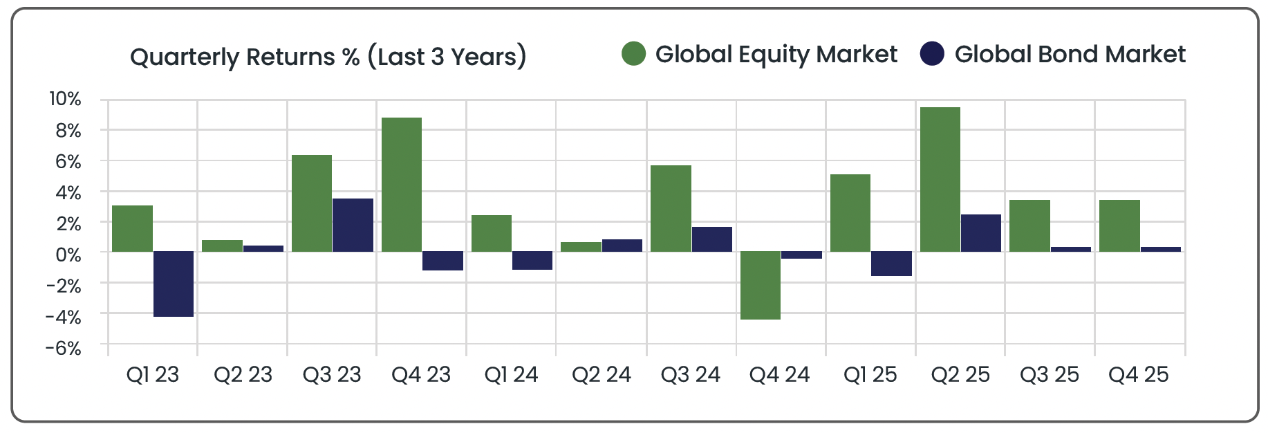 Global markets posted modest but positive returns in Q4, ending the year on a steadier footing after strong earlier gains. Global equities rose around 3.4%, led by a strong October rally on softer US and European inflation, which reinforced expectations of easier monetary policy. Sentiment weakened in November amid renewed tariff rhetoric and political uncertainty, driving higher volatility and a shift toward defensive assets, before stabilising in December. Fixed income markets were broadly flat, with small gains overall. UK gilts led the way as clarity on government finances pushed yields lower, while US Treasuries rose slightly after the Fed’s December rate cut.
