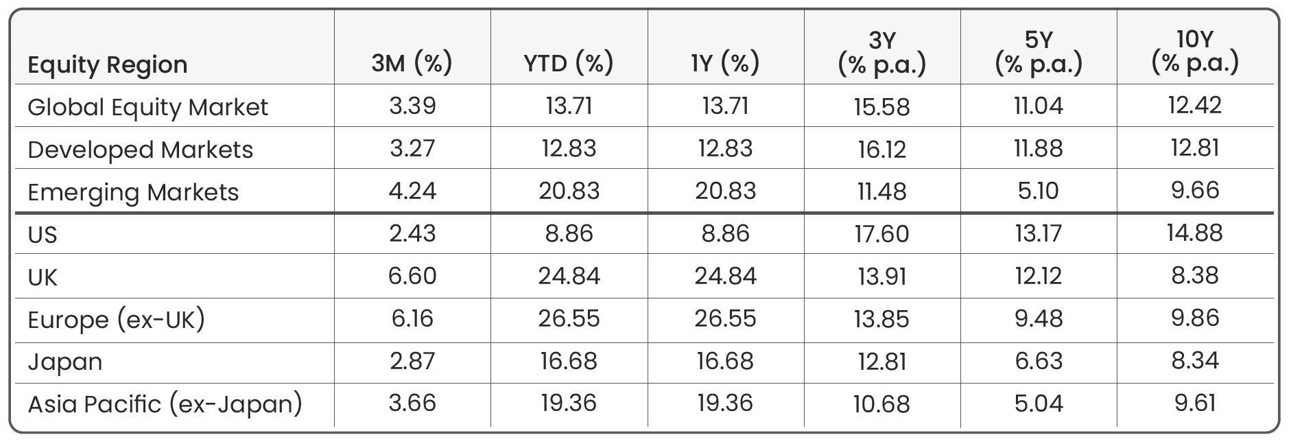 Asia-Pacific (ex-Japan) equities experienced a more uneven quarter. October strength, led by China and Taiwan, reflected optimism around stimulus measures and continued demand for AI-related exports. November saw a strong pullback as trade concerns resurfaced and global risk appetite softened. December stabilisation was driven by targeted Chinese policy support and improving sentiment toward regional technology supply chains, allowing the region to close the quarter with modest gains.