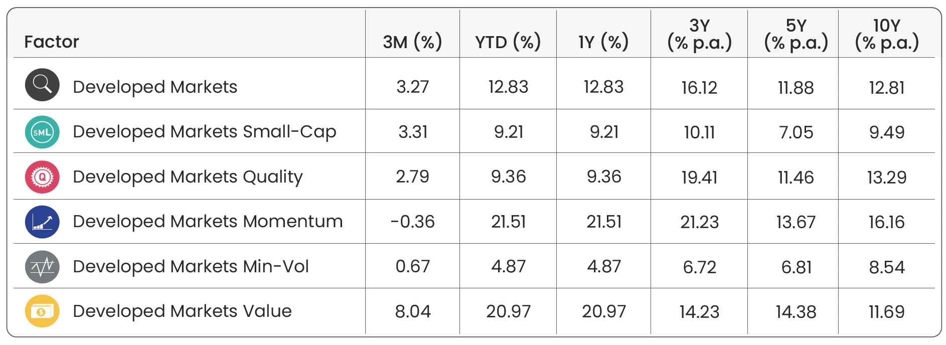 Factor Indices: Morningstar Developed Markets (Factor Benchmark) | Morningstar Developed Markets Small-Cap | Morningstar Developed Markets Quality | Morningstar Developed Markets Momentum | Morningstar Developed Markets Min-Vol | Morningstar Developed Markets Value