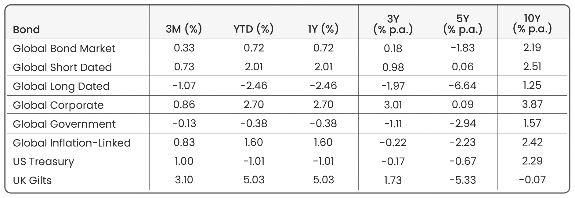 Global bonds delivered modest gains on average in Q4, with short-dated bonds outperforming longer-dated issues. Investors favoured shorter maturities as uncertainty around central bank policy and economic growth persisted. Corporate and inflation-linked bonds also posted small positive returns, supported by resilient earnings and easing inflation expectations, while government bonds were broadly flat.