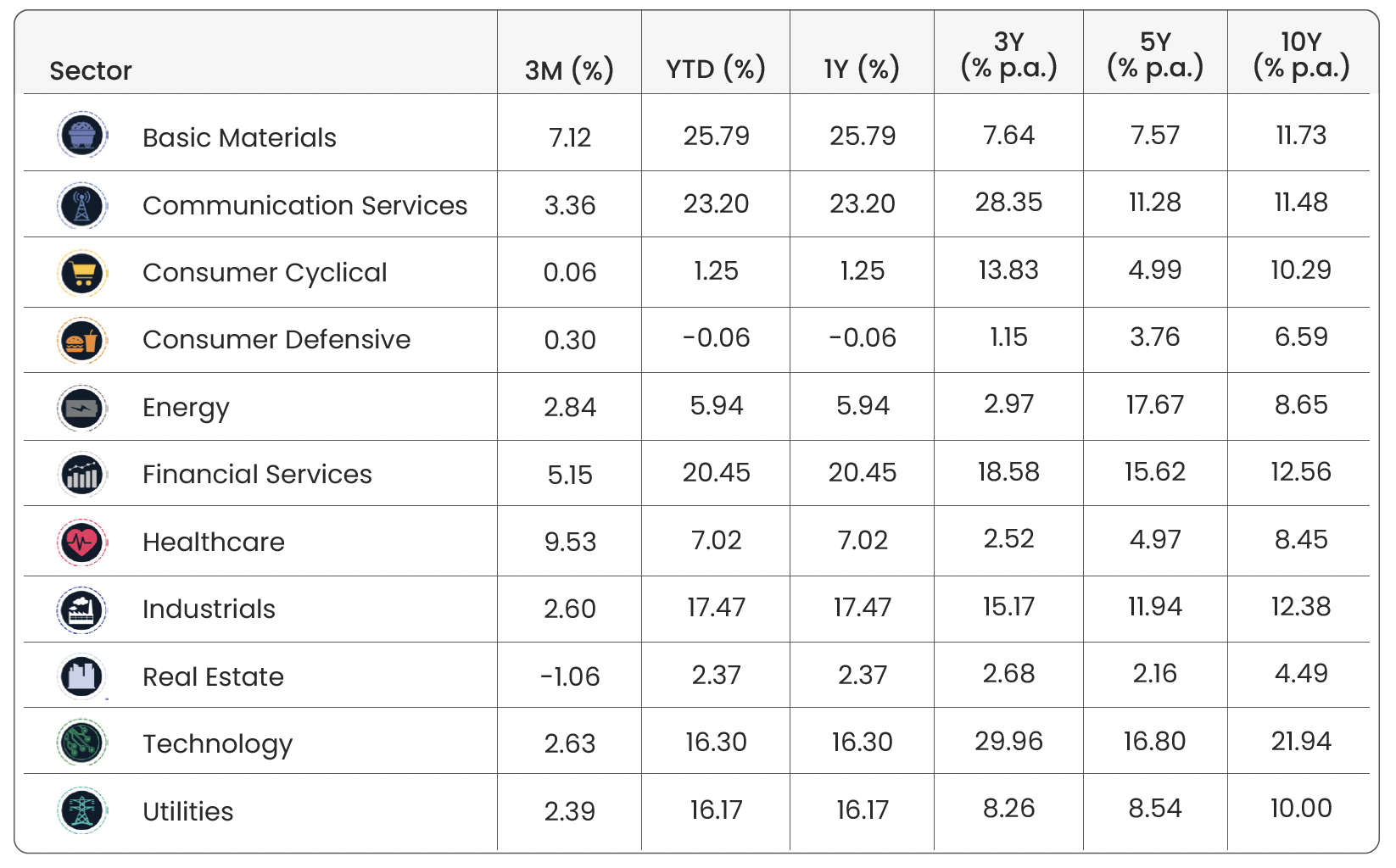 • After a blistering +13.9% gain in Q3, Technology’s growth moderated significantly in Q4 to +2.6%. The moderation reflected profit-taking after the Magnificent-7 mega-cap stocks had run sharply higher earlier in the year, combined with rising valuation concerns and uncertainty around AI investment cycles and long-term sustainability. While demand for AI-related products and cloud infrastructure remained robust, the sector’s outperformance narrowed as investors rotated into defensive and value-oriented sectors, signalling that the momentum that had driven earlier gains had started to fade as the year came to an end.