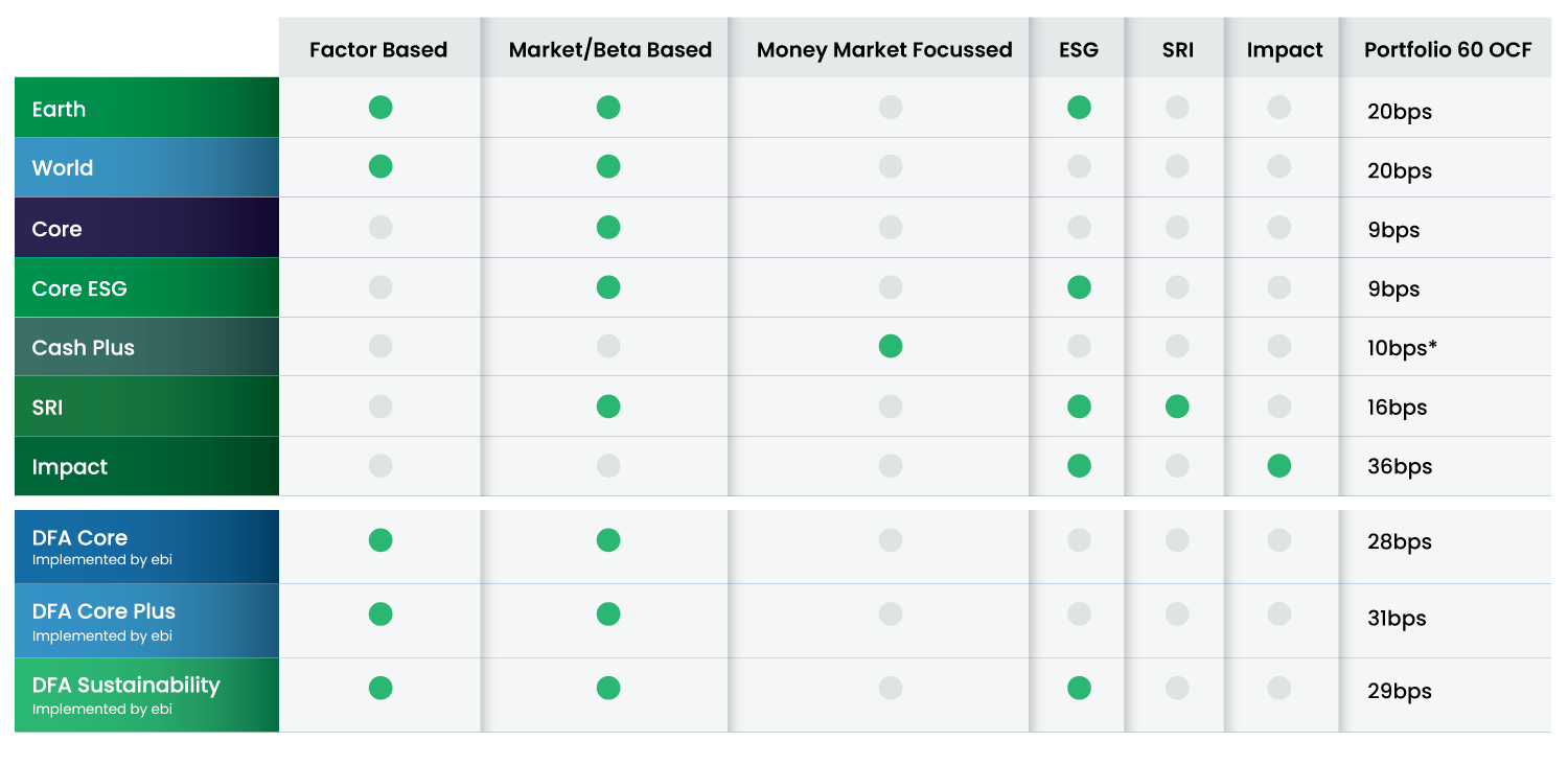 ebi’s portfolio suites are designed to meet a wide range of investor needs, including global diversification, factor-tilting, ESG-screening, and low capital risk investment strategies.